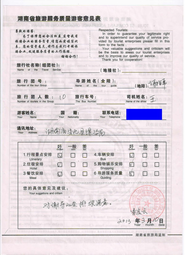 湖南李小姐一行10人旅游質量回饋單