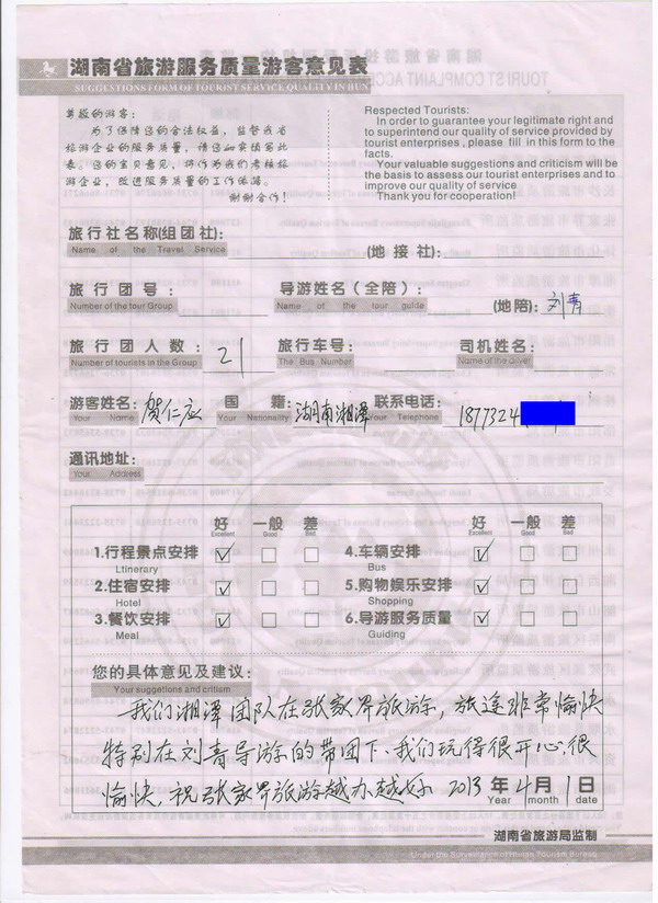 湖南賀先生一行21人旅游質(zhì)量回饋單