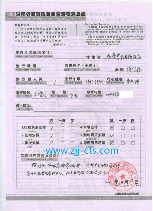 湖北王先生一行6人旅游質(zhì)量回饋單
