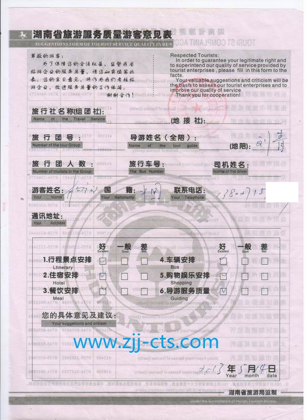 廣東楊先生一行8人旅游質(zhì)量回饋單
