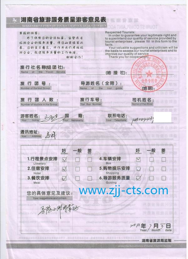 吉林馬先生一行15人旅游質(zhì)量回饋單