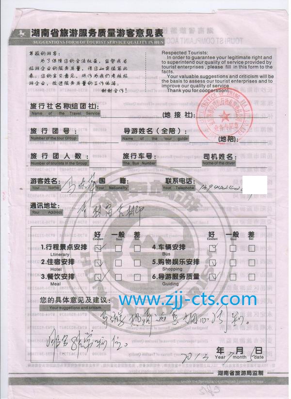吉林馬女士一行6人旅游質(zhì)量回饋單
