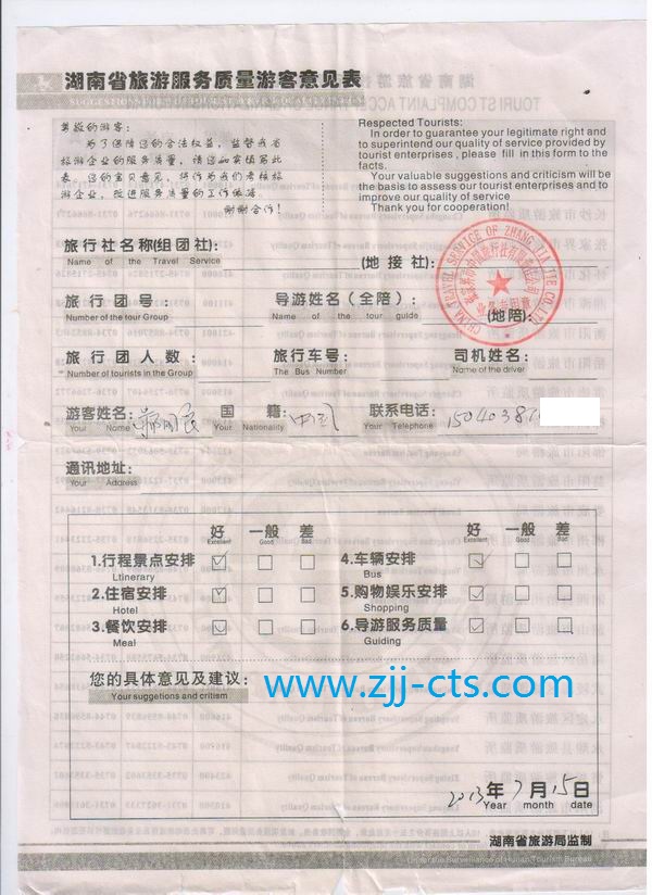 沈陽郝先生一行10人旅游質(zhì)量回饋單