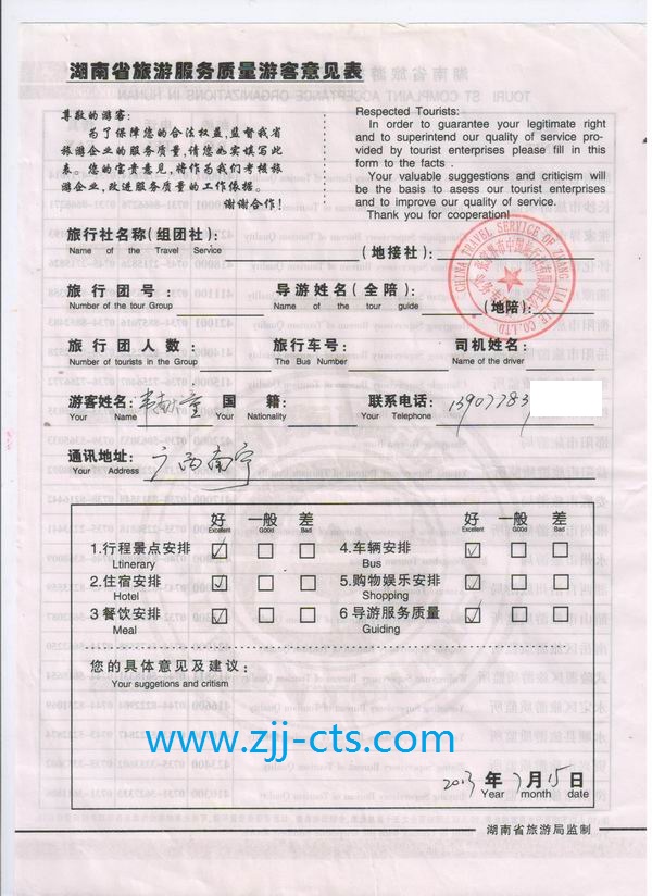 廣西韋先生一行13人旅游質(zhì)量回饋單