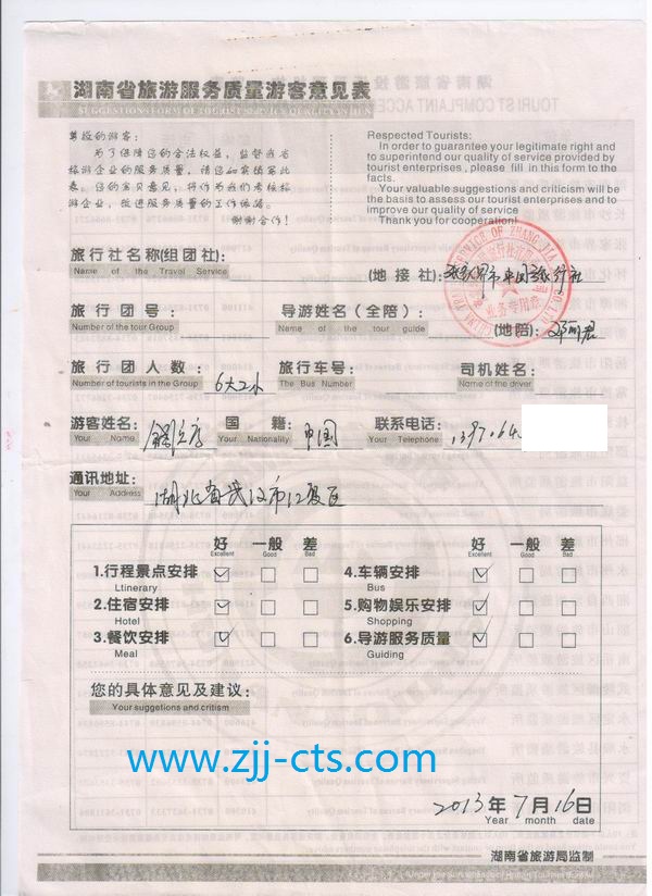 湖北佘先生一行8人旅游質(zhì)量回饋單