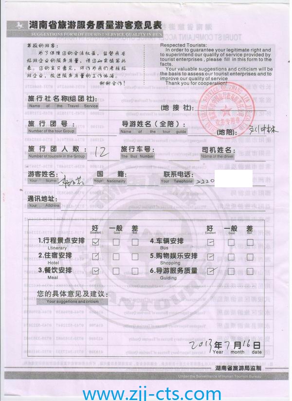 山西楊先生一行12人旅游質(zhì)量回饋單