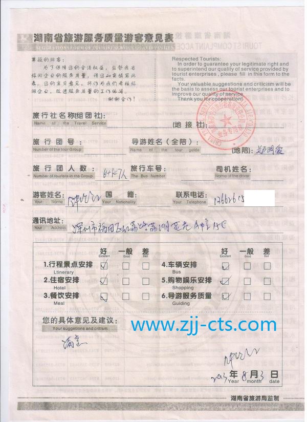 深圳鐘女士一行7人旅游質(zhì)量回饋單