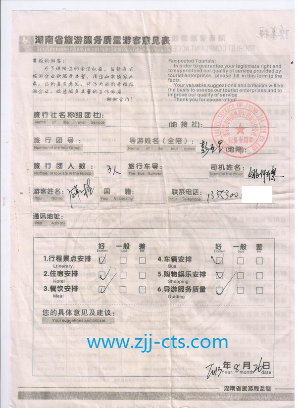 廣東李先生一行3人旅游質(zhì)量回饋單