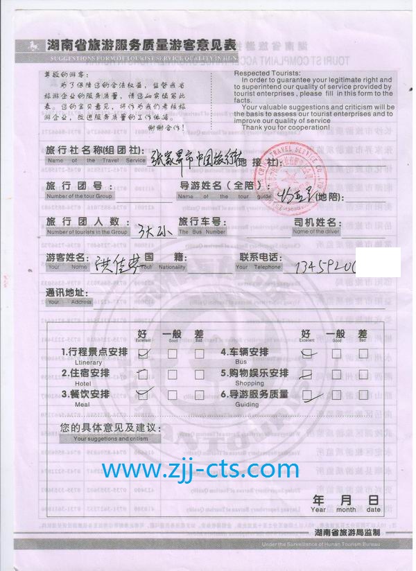 福建洪女士一行5人旅游質(zhì)量回饋單