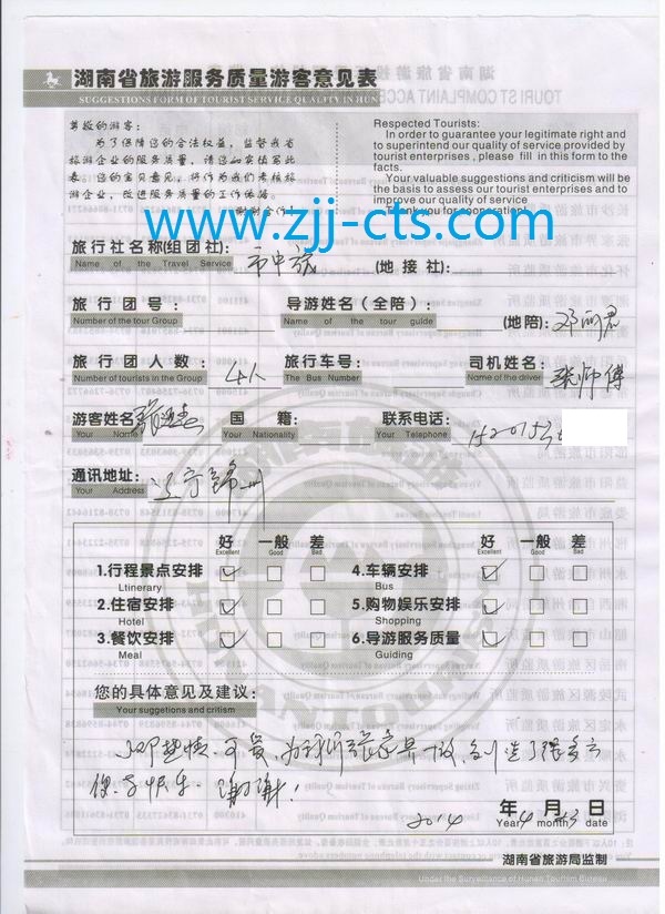 遼寧張女士一行4人旅游質(zhì)量回饋單