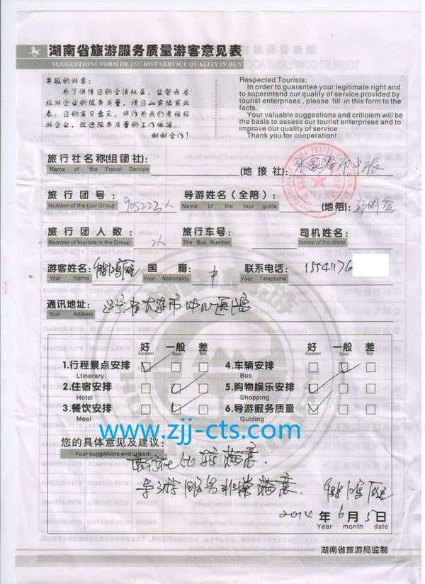 遼寧殷女士一行2人旅游質(zhì)量回饋單