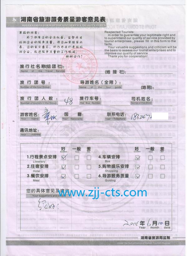 安徽章先生一行48人旅游質(zhì)量回饋單