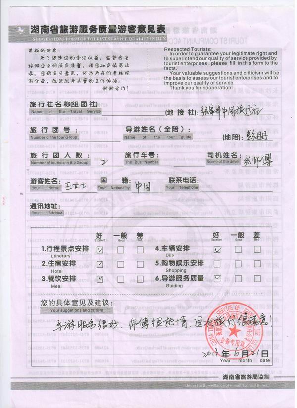 香港王女士一行2人旅游質(zhì)量回饋單
