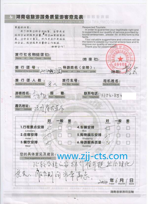 遼寧楊先生一行8人旅游質(zhì)量回饋單