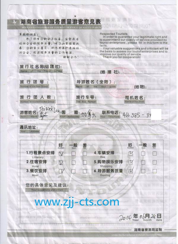 加拿大李先生一行8人旅游質(zhì)量回饋單