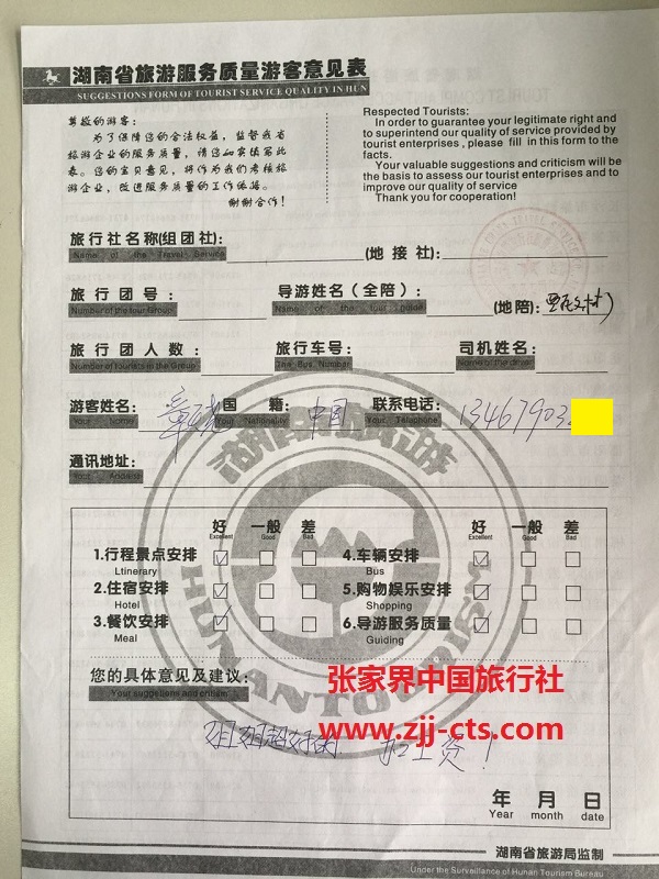 湘潭章先生一行7人旅游質量回饋單