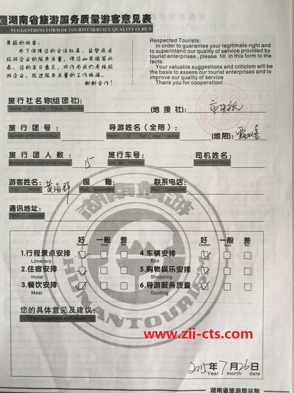 太原黃海群一行15人旅游質(zhì)量回饋單