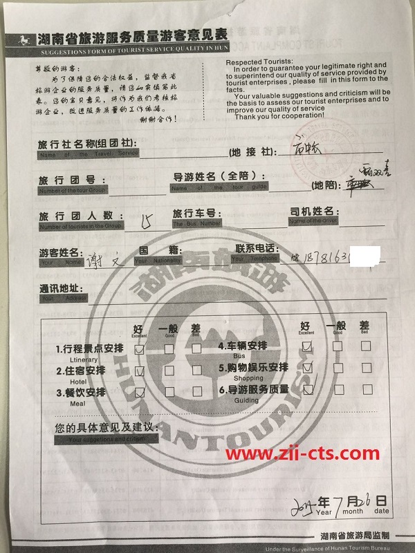 綿陽謝文一行15人旅游質(zhì)量回饋單