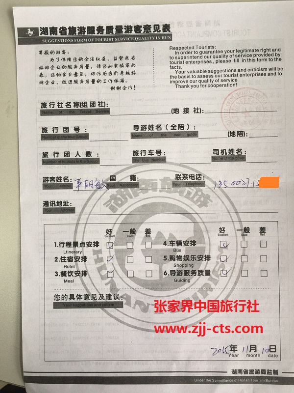 佛山嚴(yán)麗敏一行6人旅游質(zhì)量回饋單