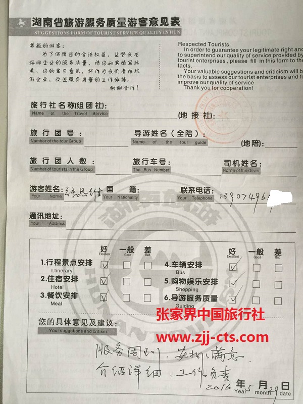長沙張思維一行18人旅游質(zhì)量回饋單