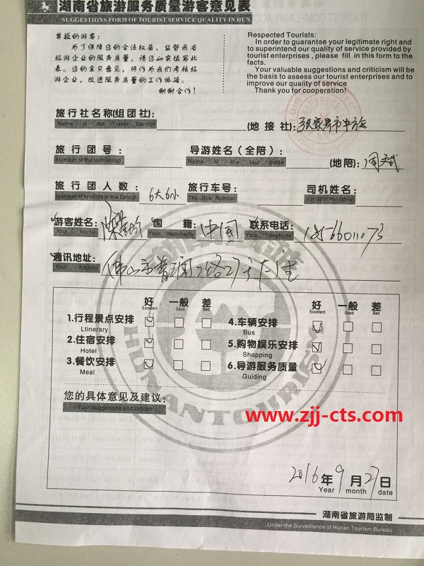 佛山陳先生一行12人旅游質(zhì)量回饋單