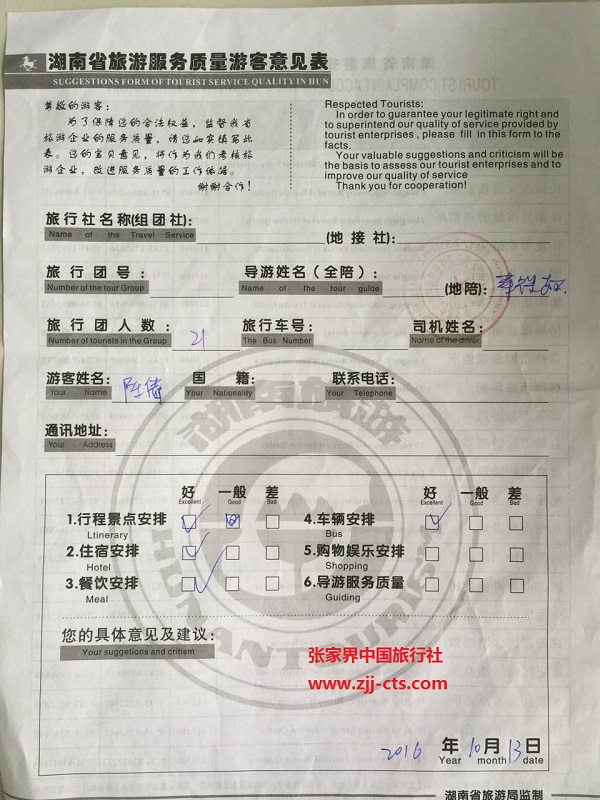 哈爾濱陳倩一行21人旅游質(zhì)量回饋單