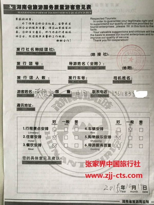 上海張德宏一行18人旅游質(zhì)量回饋單