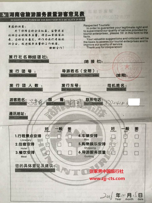 上海馬惠榮一行11人旅游質(zhì)量回饋單